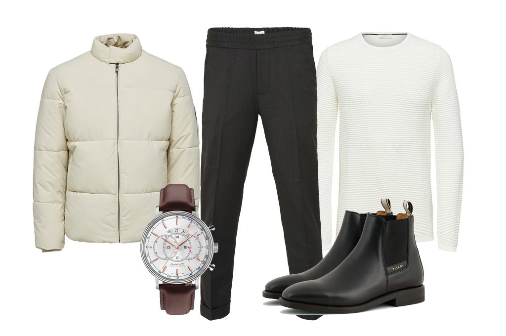 Genser fra Selected Homme – Bukse fra Filippa K – Boblejakke fra Selected Homme – Sko fra Gant – Klokke fra Gant